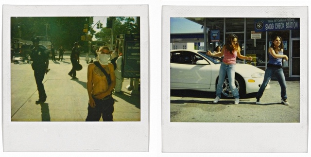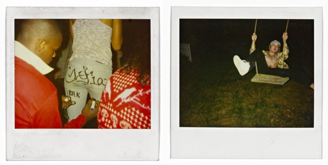 There’s delicacy in all of Snow’s production, but it feels different from a pictorial strategy, more like real humor and sweetness, and even gentleness, combined with an implacable urge to rub people’s faces in the mire. Still, there’s the question of how, or if, Snow’s own life squares with what one might call the “networked” logic his art operates against. Does one take Snow’s position entirely seriously, contrasting it with artists who assume the “Bad” mantle as a strategy? The visceral power of violence easily becomes a seductive hook for artists such as Hito Steyerl, whose 2012 video “Guards” makes full use of the jarring body language two museum guards replay from their former lives as cops/Marines, against a backdrop of works by de Kooning, Hesse, et al. The appeal of such rough play for gallery audiences is sanctioned by Steyerl’s distance from her actors’ world. And yet the deployment of working-class men in her video is essentially a temporary human transaction, contained in a project destined for the same museums where these guards continue their anonymous labor. When Snow, circa 2000, joined the tagging crew IRAK, soon thereafter this already well-known group achieved a kind of legendary status, in part because the leader of the crew, Kunle Martins, who appears in scores of Snow’s Polaroids, was an unapologetically gay black man and the tagging community was notoriously homophobic; the addition of rich kid/runaway Dash Snow, and the seeming unconventionality of their relationship, made IRAK the ne plus ultra crew of its time.