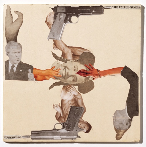 René Girard’s formulation of sacrifice in “Violence and the Sacred” hinges on this idea of substitution: “The [sacrificial] victim is not a substitute for some particularly endangered individual […] Rather, it is a substitute for all the members of the community, offered up by the members themselves. The sacrifice serves to protect the entire community from its own violence; it prompts the entire community to choose victims outside itself.” [6] In a networked economy, it’s not hard to see how a couple of museum guards (or any member of the “dispossessed” put on friendly display) can reassure viewers that their own humiliations are indeed modest, and critique thus ennobles a sacrificial substitution that contains and disperses the audience’s resentment. Snow makes no such concessions, especially in his collages and artist books, where phrases like “Died in My Arms/Struggling Gay Cops” and “Bin Laden Youth/You Can Be Controlled” convey state machinations in far more direct terms. For this, he has been excluded from the already-in-formation contempo-canon. His works do not often surface in museum surveys or biennials. His has been a different sort of sacrifice, of absence, reprobation, dismissal: as Girard comments, “Violence is not to be denied, but it can be diverted to another object, something it can sink its teeth into.” [7]