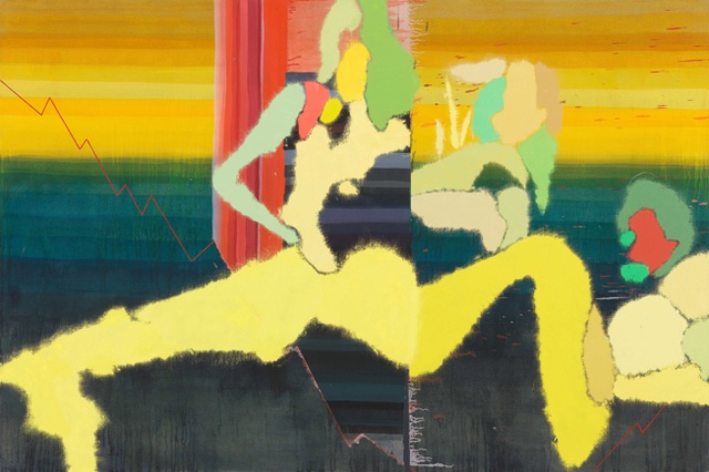 Die eine, gelungen simpel auftretende Produktlinie kombiniert konturlose, organisch-biomorphe Farbflächen; diese sind gewissermaßen parataktisch zueinander arrangiert und in ein mehrfach hintermaltes und abschließend einfarbig-wolkig lasiertes Hintergrund-Finish eingebettet. Die andere, dank aus der Pornografie adaptierter Motive inhaltlich „mehr“ versprechende Linie setzt quergestreifte Hintergrund-Pattern aus stumpf in der Leinwand versickernden Lasuren gegen relativ vehement davor herausgearbeitete Figurenkonstellationen ab; hierbei werden die ebenso wie in der ersten Sorte aus großzügig aufgespachtelten Farbflächen hergeleiteten Figurenkonstellationen letztendlich zeichnerisch in den Vordergrund gerückt, mit gestisch-grobem Ölkreidestrich nach- oder überkonturiert, mit Silhouette, Anatomie, Mimik ausgestattet. Durch die kombinierte, unregelmäßig alternierende Hängung beider Linien nivellierten sich gleichwohl die unterschiedlichen Anliegen der Plots – nicht ohne die Frage aufzuwerfen, ob und wie denn nun interessantere/gelungenere Bilder von den weniger interessanten/gelungenen zu differenzieren wären.