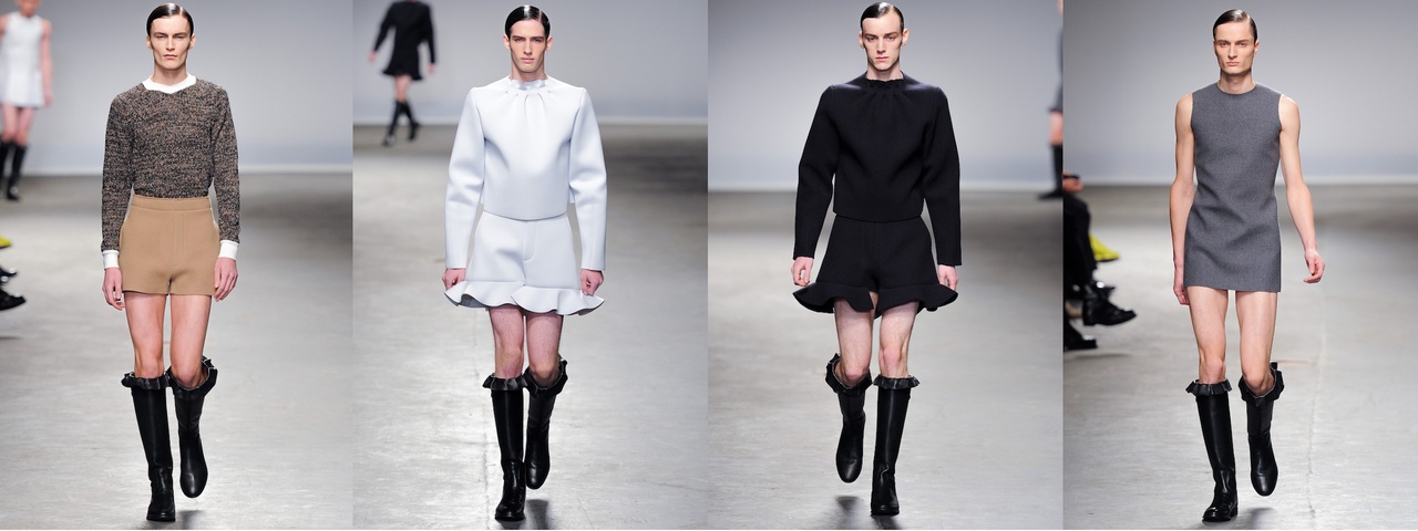 Bei der Betrachtung dieser Hosen, die „hot“ sind und auch wieder nicht, stellt man fest, dass hinsichtlich der mittlerweile klassischen Mechanismen, mit denen Mode an der Dekonstruktion von Gender arbeitete, ein Wandel stattgefunden hat: Wir beobachten beispielsweise nicht die Erfindung des Unterstatements von „weiblicher“ Kleidung durch die Integration „männlich kodierter“ Elemente (wie es Chanel tat), noch erleben wir die Konstruktion einer angeblich „femininen“ Position durch das Postulieren der Konstruktion aller Gender qua Trans-Vestismus (Gaultier, Mugler etc.), das einige Designer in der Zeit der „Mode nach der Mode“ – um Barbara Vinkens wegweisendes Buch zu zitieren – herausgearbeitet haben. [1] Stattdessen sehen wir Hosen, die wie Röcke aussehen, aber eigentlich immer noch Hosen sind. Mit diesem Kleidungsstück hat Anderson durchaus faszinierende Objekte entwickelt, die Zeichen in mehr als eine Genderrichtung senden und sich gleichzeitig weigern, sich an dem einen oder anderen Ende eines vorgeblich binären Systems (falls es noch existiert) zu positionieren. Es ist, als hätte man die Lösung der Culotte – um Frauen ein Kleidungsstück mit zwei Beinen zu bieten, das aus Gründen der Schicklichkeit immer noch wie ein Rock aussehen musste – einen weiteren Schritt vorangebracht. Oder als hätte das Verwirrspiel der (schnitt-)technischen Kategorien – Rock? Hose? Hosen als Röcke als Hosen? – die Frage nach dem vermeintlichen Gendering einfach hinter sich gelassen.