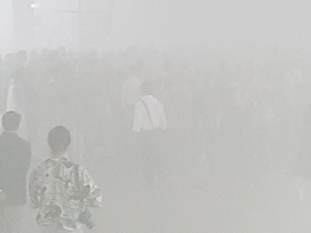 One might be tempted to read this as a relational (or anti-relational) art strategy – as the viewer, in the accumulation of fog and slight terror that comes with being one among such a mass of bodies, is certainly conscious of their presence. But unlike the common goal in relational art, “Angst” neither problematizes the viewer’s position as part of the masses nor aims to mobilize this group at large; As aforementioned, the piece is fully tolerant of passivity; there is no ’dead weight.’