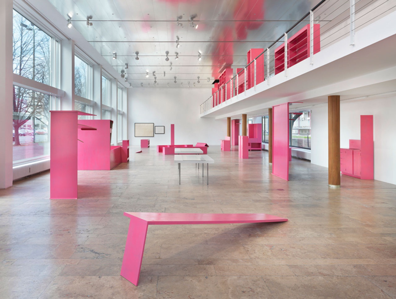 The Soviet critic and pamphleteer Viktor Shklovsky is credited with coining the term faktura . Faktura refers to the material aspect of the surface of an object. An object has to self-evidently expose how it was made, a sort of visual demonstration of properties inherent in the materials themselves. The logic of the built-in is consistent with that of faktura , as it similarly integrates the construction methods and materials of the structure within itself. In Prina’s memory of the desk, it was painted pink. He painted his reconstructed and amputated built-ins in high-gloss honeysuckle pink. As I also remember it, during a memorial service for Michael Asher held in New York, when Prina was invited to talk, he began by taking a pink wallet out of his back pocket and extending his right arm, holding it up for several endless seconds in a pose somehow reminiscent of both Perseus exhibiting the head of Medusa and a soccer referee expelling a player with a red card. While the invocation made at that moment was unquestionably a queer stance, it also impacted me because I suddenly realized that Michael Asher had lucidly and systematically critically detourned all available elements of spatiality and visuality, except for color. I then wondered, how could color be deployed in an Asherian direction? Using color in a way that highlights the symbolic connotation of the color (and in the Berlin incarnation of this piece one inevitably remembers that gay people were marched to the camps with downward pink triangles sewn to their jackets) appears to contradict both an Asherian ethos and the principle of faktura . However, when examined closely, the surfaces are alternatively opaque or shiny, they show dripping and pooling. They were imperfectly painted with one single coat. In short, the hand is present. Prina effectively manages to detourn the very idea of faktura by using the surface to express some irreducible condition of the subject, some unnamed yet existing memory of a being animating a meaning. In that sense, the application turns the symbolic function of the pink into something truly programmatic .