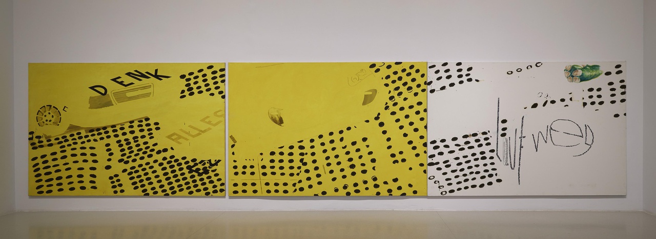 Die ältesten Arbeiten befanden sich in dieser Konzeption auf der linken Seite in an die zentrale Halle angrenzenden Kabinetten. Die drei großformatigen Gemälde Denk Alles – o. T. – Lauf weg (1995) sind noch in Öl auf Leinwand angefertigt. Großformatig und monochrom in Gelb bzw. Weiß gehalten, überziehen unregelmäßige Muster aus schablonierten Ovalen die Bildfläche. Hierin eingeschrieben sind die titelgebenden Aufforderungen „Denk Alles“ und „Lauf Weg“ sowie wiedererkennbare Formen wie Autofronten und ein Dinosaurierfuß. Schon hier vereint Schmidt unterschiedliche Modi wie Abstraktion und Gegenständlichkeit, Schrift und Abbild, Fläche und perspektivischen Raum zu einer Komposition, in der die Leerstellen die widerstreitenden Elemente in der Balance halten.