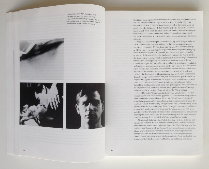 Wenn also diese „intelligenteste Version" des referentiellen Warhol eine „Projektion“ ist – die gleiche Bezeichnung, die Foster für Visual Culture verwendet –, was würde Foster zu anderen Versionen sagen, die sich zum Beispiel dafür interessieren, Warhols Werk mit schwuler Kultur in Verbindung zu bringen? Eine solche Version von Warhol – eine Version, die keinerlei Anstrengungen unternimmt, das Begehren zu verbergen, das alle Interpretationen antreibt – findet man in einer Vielzahl von Lesarten, die das Buch „Pop Out: Queer Warhol“ liefert. [26]