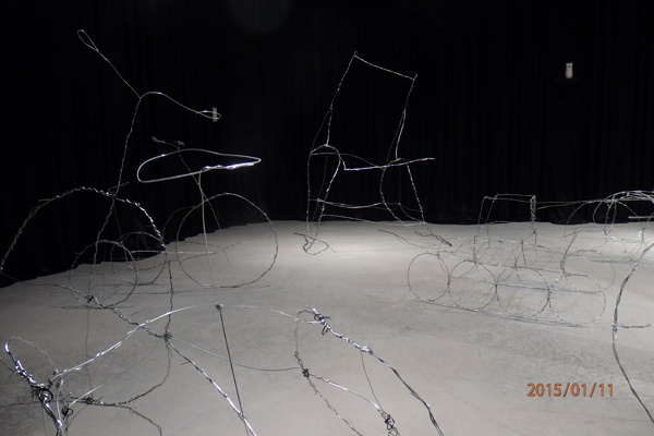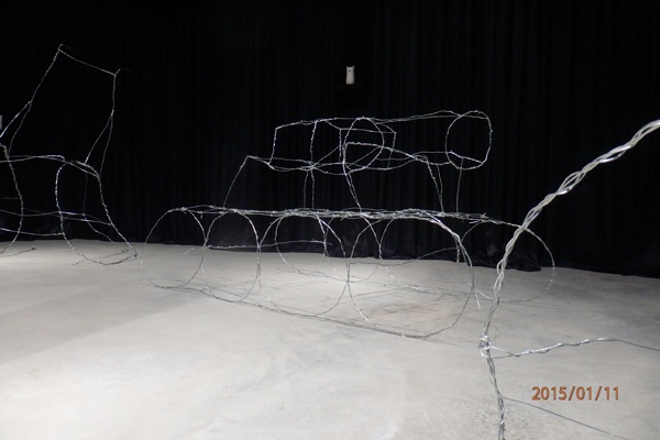 The sculptures’ thin wire frames, ranging between two and six feet in height, form irregular, silvery outlines of recognizable shapes, rendered as they might be by a child. The misshapen wheels supporting “War in August” – the figure of a wheelchair roughly the size of a fridge – tilt inwards, while the deformed chair they bear slumps to the left. With “War in October,” another wheelchair has a hard time keeping itself upright; its chairback leans precariously backwards toward the floor. In their helplessness, we find these vehicles nonthreatening; in their impotence, we find them cute.
