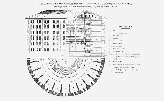 Gefängnis-Entwurf von Jeremy Bentham nach dem Panopticon-Prinzip, 1791