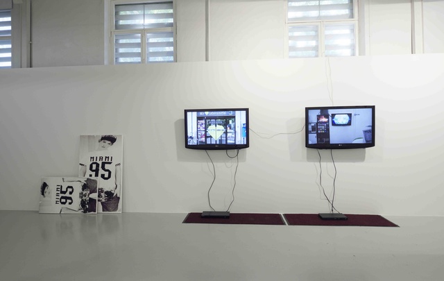 The show includes two painting diptychs: “Flâneur ’95,” placed next to the videos, and “Flâneur ’69,” at the other at the end of the gallery in the foot of the L. In both pairs, the canvases are hung at right angles to each other (so that one is rotated 180 degrees). All four paintings portray the same facsimile of a young androgynous man in American-inspired sportswear – an outsize T-shirt emblazoned with “Miami 95” and a baseball cap that reads “Los Angeles.” Clandestinely housed in the gallery’s kitchenette, there is also a Coke-filled refrigerator sculpture, “Benevolence/Malevolence,” with cans positioned alternately right way up and upside down, amid the fridge’s usual contents of red wine, milk, and mustard.