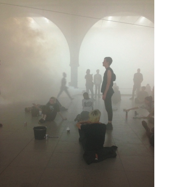 Another way to read Imhof: via the 1970s contact improvisation her performers reference – which is to say a kind of rhizomatic or cybernetic choreography, with connected but decentered movement transpiring extemporaneously according to the dancers collective intelligence, sensitivity, and care of the group. In this light, “Angst” is not meaningful because it is big, void, and beautiful, but because it is collectively constituted – a form that reflects the proto-neoliberal ideal of interaction determined by flat hierarchies and self-empowerment (i.e., prior to the self-instrumentalization version-update). Indeed, non-activity, angsty non-participation figures as a key aspect of Imhof’s work, and this is true both of her performers and her viewers. In the work, her dancers languish on raised platforms, on each other, on the bare floor interspersed with viewers, who are also, given the long duration of the piece, variously resting on the ground in proximity to whatever given action has their attention. Viewers and performers stand by, present in the way that one is present while scrolling social media but not reacting. As such, and sharing a general dress code and age, bodies in “Angst” blend within a shared cool-kid millennial aesthetic scape: glass bongs and cartons of Marlboros, metal-show T-shirts, DIY tattoos, white to-go coffee cups, multipacks of Gillette shaving cream, metal vessels and black cords, and other signifiers that, amid the masses that fill the space and against the blank institutional walls, take on a kind of semiotic value; One is compelled, for instance, to project probably undue significance into cans of Diet Pepsi being opened, then poured out zombie-like against the wall, the cola pooling at the baseboard of the concrete floor. The room could be mistaken for early morning at Berghain or a presentation by HBA (performers intermittently crossing the space with the conviction of walking a runway), haze machines clouding visibility, making the large venue feel private; turning objective institutional space into intimate club space; faces blur, bodies become distant and approximate or immediate and private.