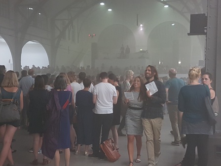 One might be tempted to read this as a relational (or anti-relational) art strategy – as the viewer, in the accumulation of fog and slight terror that comes with being one among such a mass of bodies, is certainly conscious of their presence. But unlike the common goal in relational art, “Angst” neither problematizes the viewer’s position as part of the masses nor aims to mobilize this group at large; As mentioned, the piece is fully tolerant of passivity; there is no ’dead weight.’