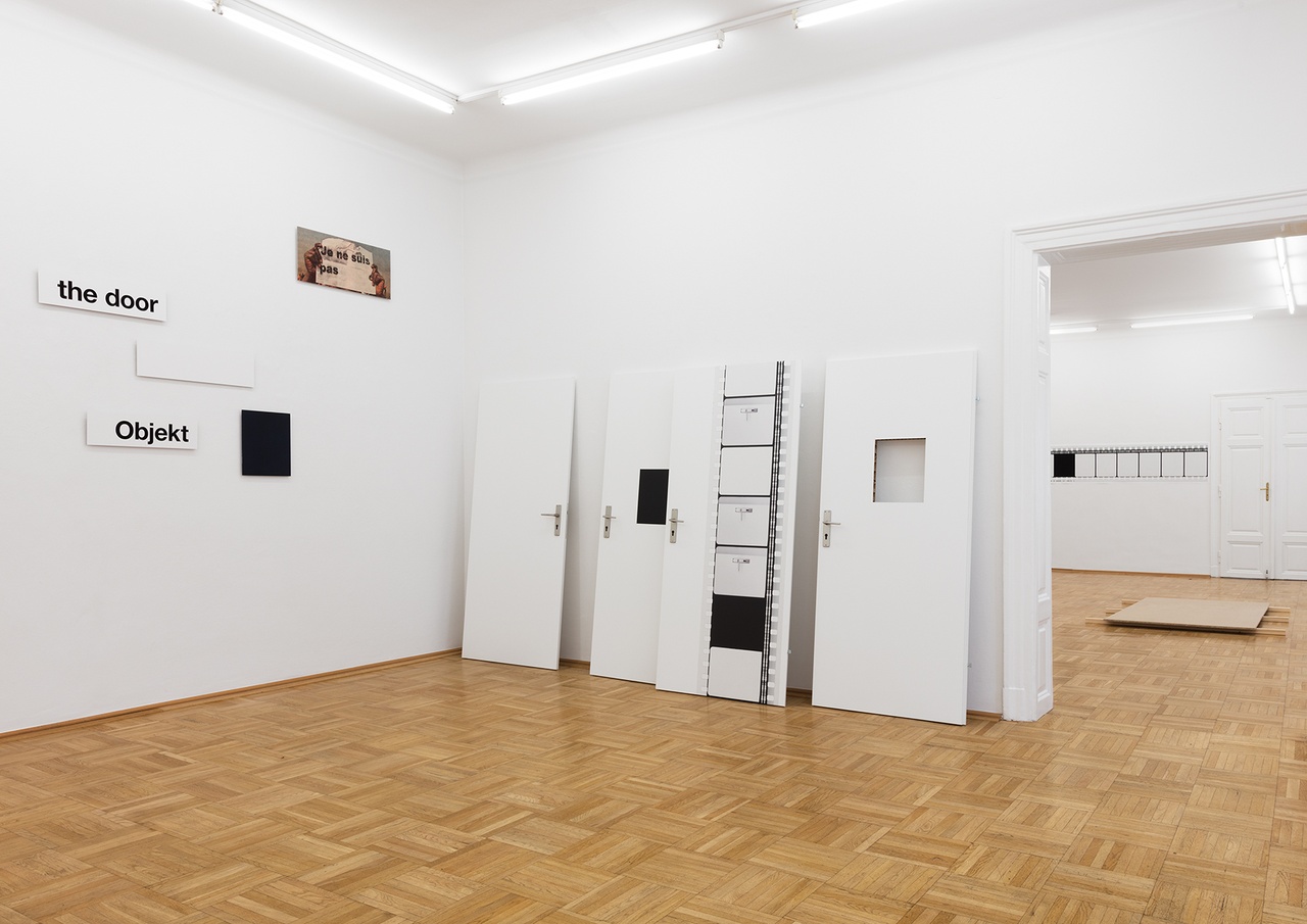 Entsprechend las sich der zweite Raum als referenzielle und verdinglichte, das heißt im Unterschied zur orthodoxen Konzeptkunst, nicht als logische oder semiotische Abstraktion: Auf drei bzw. vier nebeneinander aufgestellten, stellenweise überlappenden Türen wiederholte sich das im ersten Raum eingeführte Kombinations- und Umkehrprinzip, indem Kader und Quadrat nun von einem alltäglichen Gegenstand „ersetzt“ wurden. So erinnerten die Tür-Montagen vermutlich nicht zufällig an Duchamps Motiv der halb offenen, halb geschlossenen Ateliertür von 1927, deren Subtext kaum der Ausbuchstabierung durch die im dritten Ausstellungsraum applizierten Sentenzen – „Türen sind Worte. Worte sind Türen. […]“ – bedurft hätte. Pointierter fand ich vielmehr, dass die an sozialen Wohnbau erinnernden Exemplare doch als beredte Gegenstücke des großbürgerlichen Galerieambientes den Raum einnahmen. Spätestens hier erhellte sich Dunsts Referenz auf Marx, stellt doch das Motiv der Tür ein paradigmatisches Anschauungsbeispiel für die gebrauchswertorientierte Produktionsform dar. Wiederholung als Differenz hier einmal mehr im wortwörtlichen Sinne; sind doch Türen nicht gleich Türen, da sie sich nicht mit Türen entgelten lassen. Abstraktion erscheint somit als Ausdruck der durch Geldwerte repräsentierten fiktiven Äquivalenz. Aus dieser Perspektive nahm ich auch die vergrößerte Reproduktion eines Zeitungsbildes wahr, das zwei qua Hautfarbe markierte Hände dabei zeigt, wie sie eine Zeitung halten und so ihre*n Leser*in verbergen: Der darüber gelegte Schriftzug „Je ne suis pas“ las sich einmal mehr als repräsentationskritische Allegorie – so auf Magrittes „Dies ist keine Pfeife“ und Lacans „la femme n’existe pas“: Negierte Simulation des realen Objekts einerseits, negierte Repräsentation nicht weißer Subjekte andererseits: Die Fotoreproduktion, die unversehens an Frantz Fanons Schwarze Haut, weiße Masken (1952) denken ließ, überschrieb das für Dunsts Ausstellung konstitutive Motiv sichtbarer „Abwesenheit“ mit dem institutionsanalytischen Diskurs sozialer Ausgrenzung: Auch ein Moment, das die Absenz weiblicher Referenzen umso wahrnehmbarer machte. Dabei destabilisierten die zwischen Bedeutungsleere und -überschuss oszillierenden „Platzhalter“ und „Doubles“ – so das in Korrespondenz zur Baumarktplatte im ersten Raum stehende hybride Türobjekt im dritten Raum – patrilineare Originalitätsmythen, denn in Kombination mit Dunsts Modelperformance für die Mühlbauer-Werbung im Sommer 2019 gerieten diese zur (Selbst-)Travestie. In Nachbarschaft mit seinem rosafarbenen A-Monument erschien der in exzentrischem Hut-Schal- und Streifenkleid-Outfit gewandete Künstler als fraglos autorreflexives Double von A. B. (Banderas), dem Als-ob-Picasso serieller Geniesimulation – eine Geste, die nicht zuletzt auch Arnulf Rainer und damit referenzielle Bedeutungsproduktion schlechthin betraf.