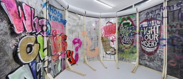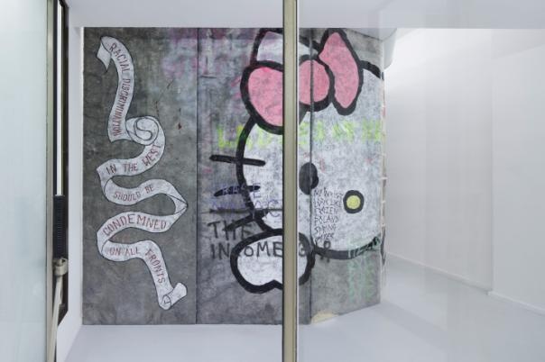 Lien and Camacho’s response can best be described as a symbolic retort – a gestural appropriation of various stylistic tropes, and as a concomitant formal inventory, at times employed to connote “Asianicity,” or “Eastness,” to use Barthesian vocabulary. [1] One could also call their response, and the entire show, an exercise in rhetorics. The installation that made up the exhibition consisted of imitation Berlin Wall slabs built from a mixture of materials that included, among others elements, papier-maché, lumber, transparent foil, and rice glue. With Lien and Camacho in charge of the work’s physical execution the two covered these segments with scribbles, paroles, graffiti, and other treatments, relying in part on suggestions from the other artists involved. The slabs were arranged in a semi-circle that cut through the exhibition space, creating an arched formation again recalling the structure of a fan. But there was yet another congruence between that object and the installation: upon closer inspection the wall’s strange, almost mildewy materiality appeared porous and light, which is to say not unlike that of the handheld fan itself; a counterpoint to the heaviness of the piece’s architectural and political reference. Motioning towards the wall that, yes, once partitioned the city into West and East, the installation stood in Mathew displaying all sorts of political demands and imperatives, sometimes also just mere observations, combined with a number of visual motifs, such as mouths wide open as if shouting political slogans, or a very large Hello Kitty face. A scroll ran down one segment: Racial discrimination in the west should be condemned on all fronts. Other statements read, Erase My Face, The Income Gap. Rote Angst (a translation of the American “Red Scare”); Reject Suckcess; and, with a tip of the hat to two issues in contemporary art and critical theory: Speculate My Dick and Post-Net Sucks. All told, it looked as if a more refined version of Berlin’s East Side Gallery had been set up on the premises of a gallery that derived at least some portion of its initial credibility from a symbolic decision to open in Berlin’s western districts, here Wilmersdorf. The work, by evoking the paraphernalia of political protest and the folklorization of the memory of political struggles, in turn exuded a composite sense of interest, bemusement, and ennui.