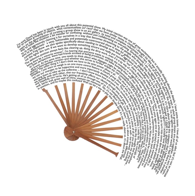 How to respond to such an interpellation? Is there an option besides merely rejecting said problematic proposal? Shades of possible alternatives appear recorded, it would seem, in the image circulated as the show’s invitation (subsequently posted to the gallery’s website) which contained text extracted from email-exchanges between Lien, Camacho and the show’s other participants (Lisa Jo, Margaret Lee, Carissa Rodriguez, Amy Yao, Anicka Yi) arranged in an arch that radiates from a photograph picturing the central linkage of a tourist’s “oriental” fan: “My initial reaction was one of great excitement but in actually thinking about the details, I have some issues. I love all of us, obvs, but it’s not an excuse for an aimless grouping of objects. what contextualizes us? race? that we have similar tastes in clothes? I thought the idea was to point out the pedestrian ways in which group shows are put together, as a sort of comment on the generalization of curating a group show in an art gallery. Its total and complete reductivism: just race. i kind of love that, it’s open for the taking.”