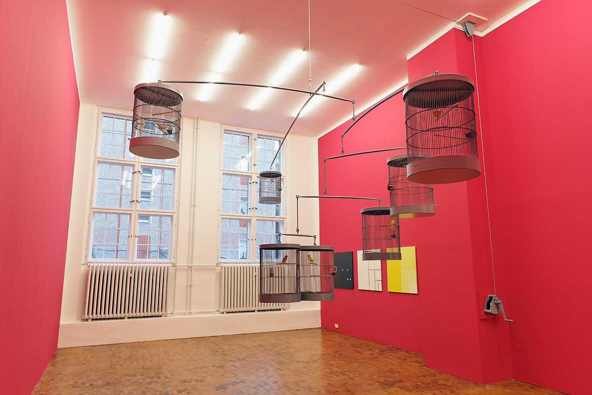 Eine alte Werber-Weisheit besagt, Tiere ziehen immer. Mit Affektproduktionen kennt Carsten Höller sich bekanntlich aus, und so ließ er für seine letzte Ausstellung in der Galerie Esther Schipper den zentralen Raum pink streichen und ein überdimensioniertes, grau lackiertes Mobile installieren, an dessen Ende sieben runde Käfige baumelten. Darin saßen zwitschernde Kanarienvögel auf dünnen Holzstangen, nuckelten von Zeit zu Zeit an einem Wasserspender und hinterließen Federn auf dem Holzboden der Galerie (Gesangskanarienmobile, 2009). Man ist Kunst, die lebt, einfach nicht gewohnt, und so fühlte man sich von der Anwesenheit der harmlosen, gelben Vögel im Ausstellungsraum zunächst überrumpelt – das Readymade kann jetzt also auch singen. Die Übertragung von vertrauten Gegenständen aus der Alltagswelt in den Ausstellungsraum hat Höller zumeist in aufwendig hergestellten Kulissen erprobt, die durch kleine mechanische Details oder technische Raffinessen an wissenschaftliche Versuchanordnung erinnerten – wie beispielsweise das sich verlangsamt bewegende Karussell, die über mehrere Etagen verlaufende Rutsche, das sich drehende Hotelzimmer oder die halluzinatorische Effekte erzeugenden Lichtinstallationen. Im Vergleich zu diesen Räumen, deren Zustände sich stetig veränderten, und in denen die Erfahrung der Besucher/innen als fetischisiertes Moment aktiver Teil des Experiments wurde, wirkte die letzte Ausstellung Höllers in der Berliner Galerie buchstäblich in sich ruhend. Denn selbst wenn die Bezugnahmen zu wissenschaftlichen Feldern, oder eher die Parodie solcher, auch hier nicht fehlte – worauf schon der Titel der Ausstellung „Vogel Pilz Mathematik“ hinwies – überwog zunächst der Eindruck, das in Farbe und Aufbau ebenso stilisierte wie bizarre Setting gleiche einer räumlich gewordenen Phantasie und würde lynchmäßig auch unter der Oberfläche leben – wobei die Möglichkeit einer Wendung des Vertrauten ins Unbekannte beiläufig suggeriert wurde. Der Pressetext klärte darüber auf, dass die Dialekte der Vögel unterschiedlich sind, was einem Laien nicht auffiel. Die Vögel waren überhaupt erstaunlich still, ebenso wie die Wand erstaunlich pink war und das Mobile erstaunlich groß. Dessen Gleichgewicht schien trotz der materiellen Potenz fragil und die in ihrer Isolierung über die Konstruktion miteinander verbundenen Vögel produzierten metallische Geräusche, die wie geheime Codes klangen. Das Unheimliche stellte sich so allerdings nicht als das Gegenteil von „heimlich“ dar, sondern war bunt, offen zugänglich und konnte trällern.