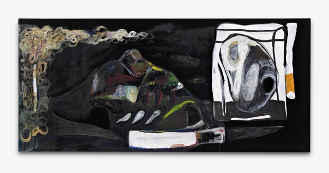 The quieter “Balea,” meanwhile, displayed prominently in the front of the space, was the work in which Schmidtlein most clearly showed off his painterly tendencies. It’s a sparse yet complex composition, with two sets of white marks resembling either skeletal hands or lines of crushed pills, between which intestines unfurl and/or viscous fluids pool. “Balea” is so compelling a painting that I initially forgot to check what unorthodox materials it contained (bath additives, various pills, cream, lacquer). Yet due to the very deftness of its composition, it almost felt out of place in a show that, for the most part, resisted fulfilling pleasant viewing expectations.