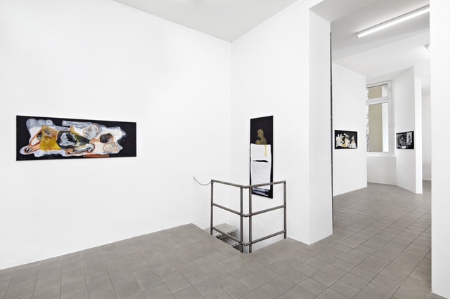 Can health really be manufactured through corporate products and practices, however ethical they are purported to be? In his solo show at Gillmeier Rech in Berlin, the young German artist Max Schmidtlein put this operating logic up for debate with a series of paintings (all works 2015) each incorporating drugstore items bought at dm. Outside the gallery’s storefront, Schmidtlein installed a light-up sign with an ever-so-slightly skewed dm logo, which supposedly attracted excited neighbors to ask whether the chain store was opening shop. (Would they have been so thrilled, one might wonder, were the sign to instead read ‘Rossmann’ or, R.I.P., Schlecker – companies not likewise known for such clean and happy corporate agendas?) Inside the space, eight semi-figurative paintings on black cotton and silk formed a somewhat desolate, somewhat grotesque, and vaguely comical portrait of the human consumption and expulsion of artificial products.