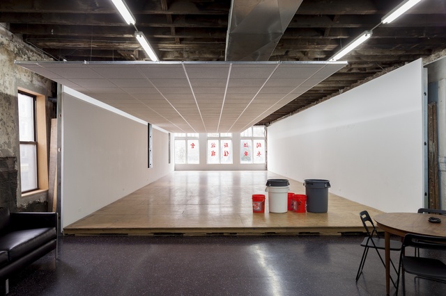 It’s on this “discussion island,” as the press release puts it, that the “neutral, possibly weak move” of “repeating relational aesthetics” took place. For the opening, mojitos were mixed and served in large plastic garbage bins and paint buckets. These sat, emptied of the drink, on the otherwise bare platform for the remainder of the exhibition, with only a couple stacks of plastic cups indicating to later viewers the bins’ purpose in the show. If this return to relational aesthetics and its economy of experience seemed lame, that was not only the point, but one that Lehan emphasized by staging the action under the ceiling’s bleak cover: the dreary, ironically liberatory ‘fun’ of Mojito night served as testament to the banality of the lives of art people.