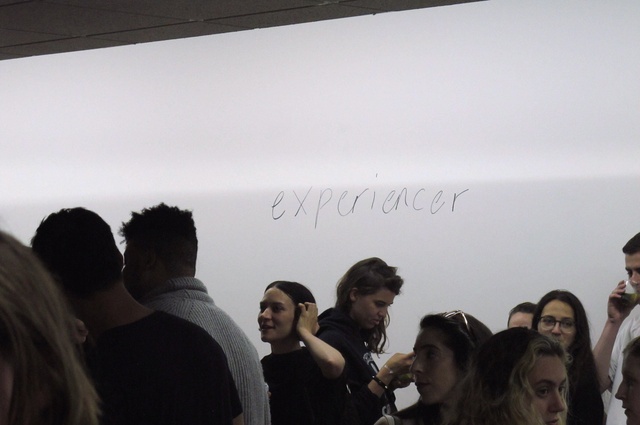 The third and most potent element of Lehan’s sparse show was a word scrawled on the gallery’s wall: experiencer. The perfectly awkward handwriting – messy and large – left a punkish human trace (again, reminiscent of the writing Carpenter left on his “Opening” paintings). But with Lehan, the more open-ended Experiencer – not the artist, nor necessarily the viewer – was the protagonist: a character type to populate the insipid confrontation between dropped ceilings and sugary cocktails. Experiencer replaces Consumer as s/he takes over as the paradigmatic (aesthetic, relational, or otherwise) consumer-subject of liberal market democracies. In this sense Lehan’s script played on Carpenter’s set-up by neutralizing its vertical relations. With “Return to Problem,” the artist’s act is not at the center of the exhibition. Rather, Lehan mimicked the maker’s mark but left the authorial role as an “available subject position.” But, to me, “Experiencer” didn’t register as “available” at all: the scribbled word read like a prescription, one mutually enforced by every person in the room. Visitors were, without effort, bound to the role. The experiencer was there to look, to drink, to witness – to generate vitality (value) for the artist, the gallery, themselves, the economies in which they exist.