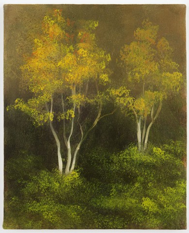 Hohn’s paintings don’t seem to enjoy their own informe muckiness too much, nor are they ever truly nasty. The surfaces of the paintings are tense, awkward in their abortive attempts to cover up their own tracks - the pressure of the half-muted. Although the most obvious similarity is with the series of five small plaster panels, also icing-like but painted a brown reminiscent of John Miller’s fecal reliefs, such tension is also visible in the landscapes, especially in the way the heavy skies push against the wispy evergreens, almost to the point of choking them.