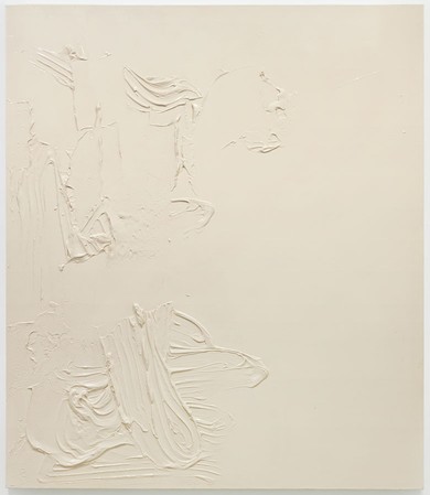 Another low blow is delivered in the three „Tan Enamel canvases", also from 1993. To create these works, Hohn smeared modeling paste in sloppy arabesques across the surface of the canvas, but then, as if to apologize for the persistence of such a flagrantly expressive gesture, went back over the marks, partially cleaning them up with sweeping redistributions of the paste all too evocative of how icing gets spread across a cake. In one „Tan Enamel“, patches of moldy green are even visible beneath the beige enamel paint, an especially pointed example of Hohn’s insistence on the off. Comparisons are unavoidable to what, in the early 1990s, was promoted as the „abject”.