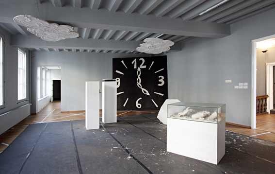 The exhibition's nod to dramaturgy is extended by Dillemuth as he fills the entire upper story with an installation composed of disparate works, some older and some made especially for the show, that seek to conjure a freshly dead social system with totems such as a giant painted clock, plaster clouds with embedded speakers, and dismembered arms clawing in the dust, as well as objects of modern science, such as the screeching sound of an MRI scanner, emitted by turning a crank fixed to the side of a plinth. The Dillemuth room seems to exemplify the curators' interest in giving a macabre or burlesque spin to formalist impulses, an urge native also to Dillemuth's deflationary narratives of bohemian social ferment and artistic genius as capitalist shamanism. The financial markets as scenes of dialectical morality plays, yielding narratives of triumph and anguish that evoke the metaphors of religion, now forms the object of study of 'behavioural economics', an emerging discipline which seeks to temper neoclassical dogma with a combined thrust from the pseudo-science of economics and the pseudo-science of social psychology. The tragedy of herd cupidity is depicted in „Failure to Control the Animal Spirits (2)“ (2009), which updates Hans Haacke's "Condensation Cube" for an era of stockmarket woe – the disembodied forearms of traders claw disconsolately at a clay floor, like living lobsters in the aquarium of an upmarket restaurant. „495 Jahre im Schatten eines abgestumpften Rhomboeder“ (495 Years in the Shadow of a Truncated Rhombohedron) (2009) is a cast of a male torso trapped underneath a rhomboid, both in white plaster, with the rhomboid taken straight from its symbolic significance in Albrecht Dürer's Melancholia print. Yet the connotation of the rhomboid here remains at issue – it could as easily be an asteroid of art market failure as the intolerable burden of 20th century abstraction.