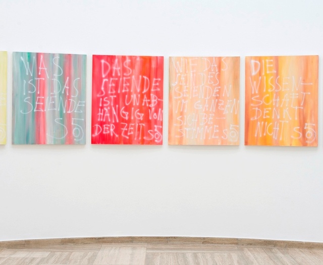 Dies gilt sogar noch für die letzten, nun geradezu obsessiv gemalten und gezeichneten Serien, etwa den prominent an Stirnwand bzw. in der Apsis des Künstlerhauses installierten Zyklen „Studio Lascaux 972“ und „Heidegger“ (beide 2005). Setzt Ersterer buchstäblich beim Anstrich als Grundlage aller Malerei an und wird zum in der Farbe Studio Lascaux gemalten Protokoll seiner eigenen performativen Herstellung, erstreckt sich im „Heidegger-Zyklus“ eine aus „Sein und Zeit“ gewonnene Blütenlese auf achtzehn mittelgroße Hochformate. Während die einzelnen aus dem Zusammenhang gerissenen Sentenzen umso typischer ‚heideggern’, werden sie mittels Airbrush-Technik grenzwertig auf pastellig-lasierende Hintergründe getaggt und geben inklusive Schreibfehlern à la „Das Nichts Nichet“ eine Art Therapiekunst zwischen Pathos und Banalität ab.