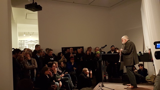 It should be remembered in this context that Brötzmann was himself frequently a target of the Left, often accused of bourgeois elitism and of merely concocting noise without any legible political content. Brötzmann frequently played at universities in Berlin in his early days, and during those fateful years of student protest many reacted violently at his concerts in West Berlin’s Technical and Free Universities. Brötzmann’s fleeting, understated recourse to blues scales and fragmented jazz vamps ultimately reminded listeners that for all of A 370 90 89’s ham-handed efforts to bridge disciplinary divides under the rubric of the neo-avant garde, Brötzmann has always understood his own practice within a genealogy of musical precedents, first and foremost. In 1968, Brötzmann declared that the brutal mechanisms of society had provoked his brutality of musical form. That was then, but what exhibitions like this are at pains to articulate is the fact that those very same conditions, the brutality Brötzmann referred to in 1968, continue to be with us, only more so. The archive on display in A 370 90 89, as with so much in the world of exhibition-making, depends on historical distance, or closure, in order to mark the end of something that can then subsequently be memorialized within the white cube. Brötzmann’s presence refuted such constructed fictions – that a moment had passed, or that the brutality of society was somehow relegated to the roiling ’60s – testifying instead to the living-on of ’68. Brötzmann is not known for shying away from the limelight, but on a very cold January evening in Berlin, he gestured to just how awkward it might appear for him to be singled out against the backdrop of a history interwoven with so many ongoing or forgotten struggles for freedom and equality. Brötzmann was alone on stage, but his references – something jazz is especially accomplished at producing – offered a lyrical nod to the survival of a musical tradition that was itself born of the hardships involved in finding one’s way through a landscape beset by racialized violence and social oppression. Music – live music in particular – can construct such alliances in the act of performing, renewing and recalling histories while making them sentient and real in the here and now. Wasn’t this part and parcel of the rhetoric of the ’68ers – to abolish history understood as class struggle and make the rousing present the only temporal horizon?