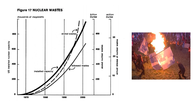 Grafik aus „Die Grenzen des Wachstums“, Studie des Club of Rome, 1972; rechts: Polnische Nationalisten verbrennen Facebook-Flaggen, 2016