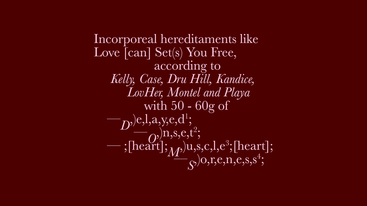 “Ima-Abasi Okon: Incorporeal hereditaments like Love [can] Set(s) You Free, according to Kelly, Case, Dru Hill, Kandice, LovHer, Montel and Playa with 50 - 60g of –D,)e,l,a,y,e,d1;—O,)n,s,e,t2;— ;[heart];M,)u,s,c,l,e3;[heart];—S,)o,r,e,n,e,s,s4,” Van Abbemuseum, Eindhoven, May 10–September 21, 2025.