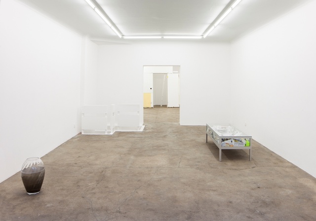 Der zweigeteilte Raum der Galerie Silberkuppe erscheint wie der Betriebsbereich hinter einer Bühne. Wie ein nichtöffentliches Setting – privat und authentisch, ganz ohne theatralischen Schein und vor allem ohne Akteure. Sogleich richtet sich der Blick auch bei den beiden Arbeiten im Eingangsbereich auf das wenn nicht Privat-Verborgene, so doch von der Außenwelt Abgeschirmte. „Coffee/Table/Book“ (2014) und „Wishing Well“ (2014) bestehen beide aus Glasbehältern mit Inhalt: ersteres eine Vitrine, randvoll gefüllt mit Diversa wie Notizzetteln, ausgedruckten Emails und Texten, Zeitungen und leeren Zigarettenschachteln; letzteres eine Vase, die eine trübe Flüssigkeit beinhaltet. Die Arbeiten vermitteln den Eindruck von Skizzen für eine Handlung, die sich nicht auf den ersten Blick erschließen lässt. Denn anstelle einer aktiven Performance, wie sie so oft Teil von Gerry Bibbys Praxis ist, wählt der in Berlin lebende australische Künstler hier subtile performative und plastische Gesten, die zwischen Objekt und Text ausgetragen werden.