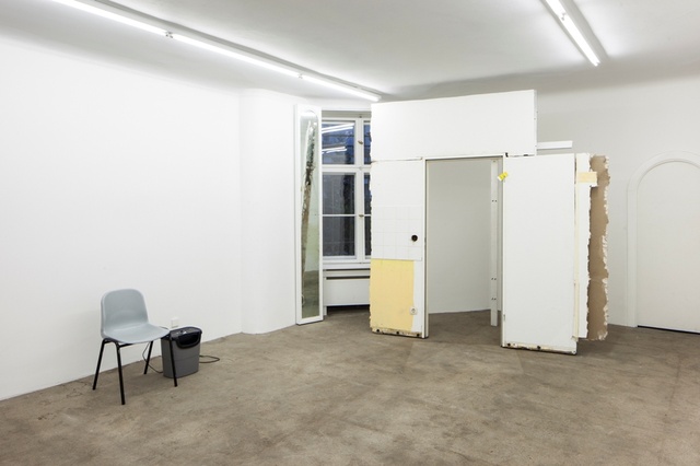 Zurück in der Ausstellung erscheint die Arbeit „Outtake/Curious (Yellow)“ (2014) wie eine Seite aus diesem Buch: eine Wand, herausgerissen aus Bibby’s eigener Wohnung, wurde vor Ort neu zusammengesetzt und durchläuft nun als funktionales Objekt eine Veränderung im Raum. Betritt man die Galerie, ist die Sicht auf den hinteren Teil des Raums frei, sodass sich die beiden Raumteile an der Mittelachse zu spiegeln scheinen. Jede dieser Öffnungen ist Eintritt und Austritt zugleich, die Bewegungen im Raum implizieren. Eine ausgedruckte Version von „Under Pressure (Microsoft Word Remix)“ (2014) befindet sich eben auf dieser Mittelachse und dient als Verbindungsstück, für das sich Bibby an diversen Texten bedient, die von Online-Lyrikplattformen stammen. Textfragmente wurden kopiert, anschließend durch den virtuellen Schredder gejagt, um sie mit Hilfe eines Schreibprogramms zu einer abstrakten Buchstabenzeichnung neu abzumischen. Eine poetische Geste, die sich nicht an ihren Objektcharakter klammert: Das Ergebnis kann man sich auf der Website der Galerie herunterladen und selbst ausdrucken. Zerlegt man diese Arbeit in ihre formalen Einzelteile, werden Schnittstellen zwischen Objekt und Text sichtbar; die Semantik des performativen Akts des Remix und das daraus resultierende Gedicht unterstreichen die Gleichstellung der beiden Formate. Der Stuhl und Aktenvernichter im hinteren Raum („Formerly known as Mr. Stockholm Syndrome“, 2014) – beides Objekte, die von früheren Ausstellungsorten mitgenommen wurden – betonen die Verlinkung zum aneignenden und neu zusammensetzenden „Dichtungsprozess“. So könnte man auch meinen, dass die Färbung der laugenartigen Substanz in der Vase („Wishing Well“) von Tinte oder Druckerschwärze stammt. Tatsächlich handelt es sich um Heizungsflüssigkeit, die Bibby während der Ausstellung „Combination Boiler“ (2014) im Londoner The Showroom abgefangen hat (Bibby selbst nennt diesen Prozess „ausbluten lassen“).