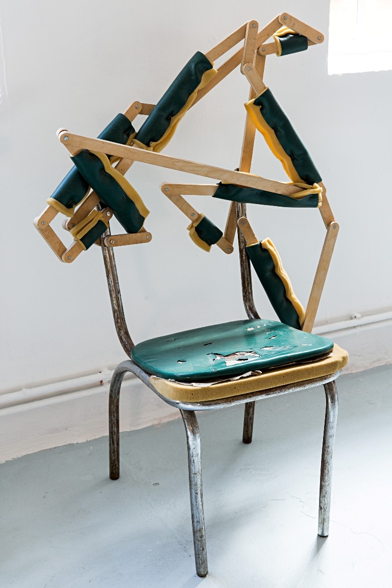Natürlich ist es auch das, was Hunekes Arbeiten immer schon verweigert haben: Was sie zusammenleimte, wirkte nie, als sei es auf Dauer gesetzt, als habe sich hier etwas von Zauberhand zusammengefügt. „Voyeuse“ heißt ein Objekt von 1995, ein modifizierter Stuhl, der jetzt in Lüneburg steht und wirkt, als habe sich seine Lehne an der Stelle zum Gewächs verselbstständigt, wo sie eine Holzkonstruktion aus kurzen per Gelenk verbundenen Lattenstücken ersetzt. Mit angestoßenen Beinen und zerrissenem Sitzpolster erscheint der Stuhl auch mehr malträtiert als bearbeitet – als sei mit ihm nicht etwas vollendet, sondern angegriffen worden. Es ist eine Ästhetik, die den Prozess, die nicht das Gemachte, sondern das Machen zum Sprechen bringen will. Eine Ästhetik, die noch einmal aufs Ganze, nämlich auf die Grenzlinie zwischen Kunst und Leben zielt: für die das Atelier zur Galerie, die Galerie zum Atelier, das Interieur zur Installation und die Künstlerwohnung zum Caféhaus werden konnte.
