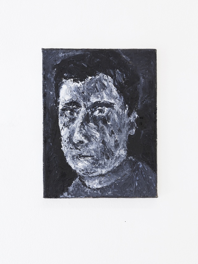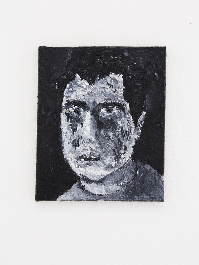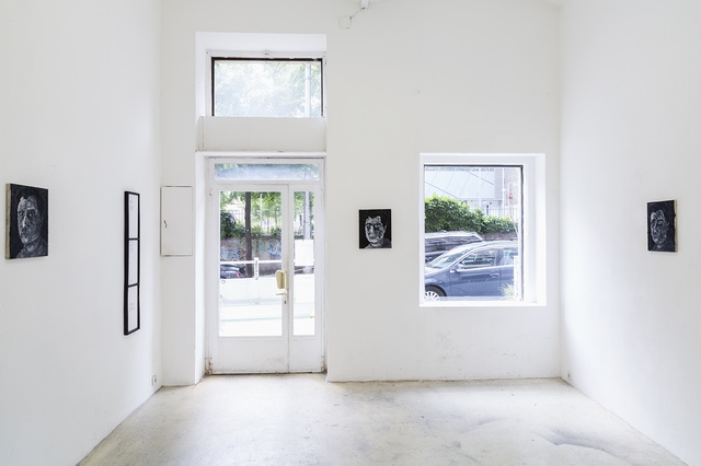 In der Ausstellung waren sieben kleinformatige Ölmalereien zu sehen, die in schwarz-weiß-grauen Farben Selbstportraits des Künstlers zeigen. Die Portraits wirken etwas grob, da sie mit Spachteltechnik gefertigt, und auf recht rauer Leinwand gemalt sind. Sie waren in dem circa 25 qm großen Ausstellungsraum in etwa gleichen Abständen rund herum gehängt. Nah bei der Eingangstüre, fast dahinter, war ein dunkler, länglicher, mit zwei Querstreben versehener Holzrahmen zu sehen, in dem auf Papier Gedichte des Künstlers in Schreibmaschinenschrift abgedruckt standen. Der erste Eindruck des Gesamtsettings war solchermaßen, dass man im ersten Moment nicht einordnen konnte, aus welcher Zeit der letzten beiden Jahrhunderte diese Arbeiten stammten. Bei näherer Betrachtung erinnerten die Bilder an neoexpressive Malerei der achtziger Jahre. Dem zuträglich war auch der auffällig pastose Malstil, mit dem die Arbeiten gefertigt sind.