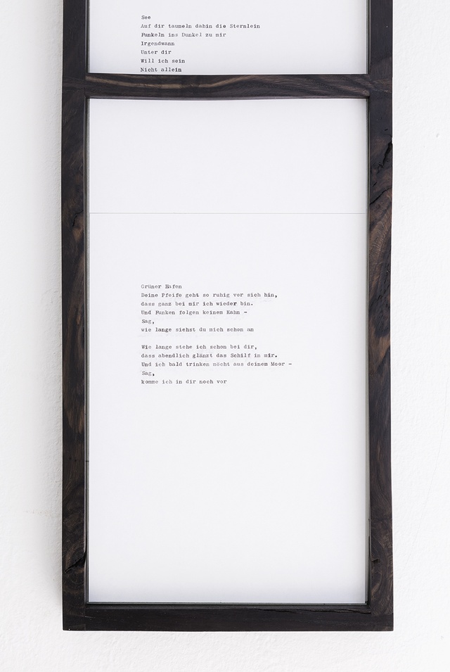 Die Gedichte wirken den Portraits gegenüber sentimental und sehnsuchtsvoll. Diese Personen haben diese Gedichte geschrieben? Nahe am Klang romantischer Dichter, reihen sich Sätze und Wortabfolgen, deren offenherziger Schneidigkeit man sich kaum erwehren kann. Durch die Rahmung stellt der Künstler zugleich Distanz her; das 5000 Jahre alte Mooreichenholz wurde mit zwei eigenwilligen Querverstrebungen versehen, unter denen die Gedichte wie auf Analogfilm hindurch zu laufen scheinen. Auch die Gedichte schließen offensichtlich nicht an einen zeitgenössischen Diskurs an. Sie lösen aus heutiger Sicht eher Unbehagen aus. Es entsteht Verwirrung ob der etwas altertümlich anmutenden Sprache. Denn Sentimentalität ist der wohlste Platz, den man sich nicht erlaubt. Scheinbar ohne Ironie geschrieben, behaupten sie sich in der Sprache einer offenen Gedichtform. Im Jahr 2016 mag das wie eine konzeptuelle Setzung erscheinen, zugleich hat man keinen Anlass ihnen zu misstrauen.