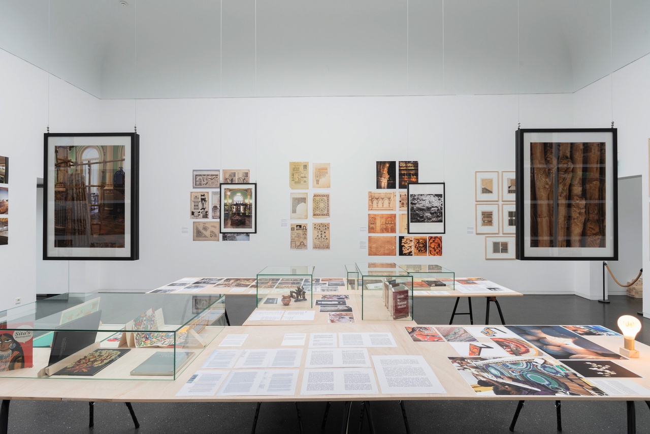 „Kaiwan Mehta: A view from Ornament: Design Debates on Indianness“, Württembergischer Kunstverein, Stuttgart, 2018, Ausstellungsansicht, Präsentation mit Werken von: Jitish Kallat, Madhav Raman, Annapurna Garimella, Rooshad Shroff, Abin Chaudhury, Rahul Mehrotra, Atul Dodiya, Revathi Kamat, Shimul Javeri Kadri, Ambrish Arora, Akshat Bhat