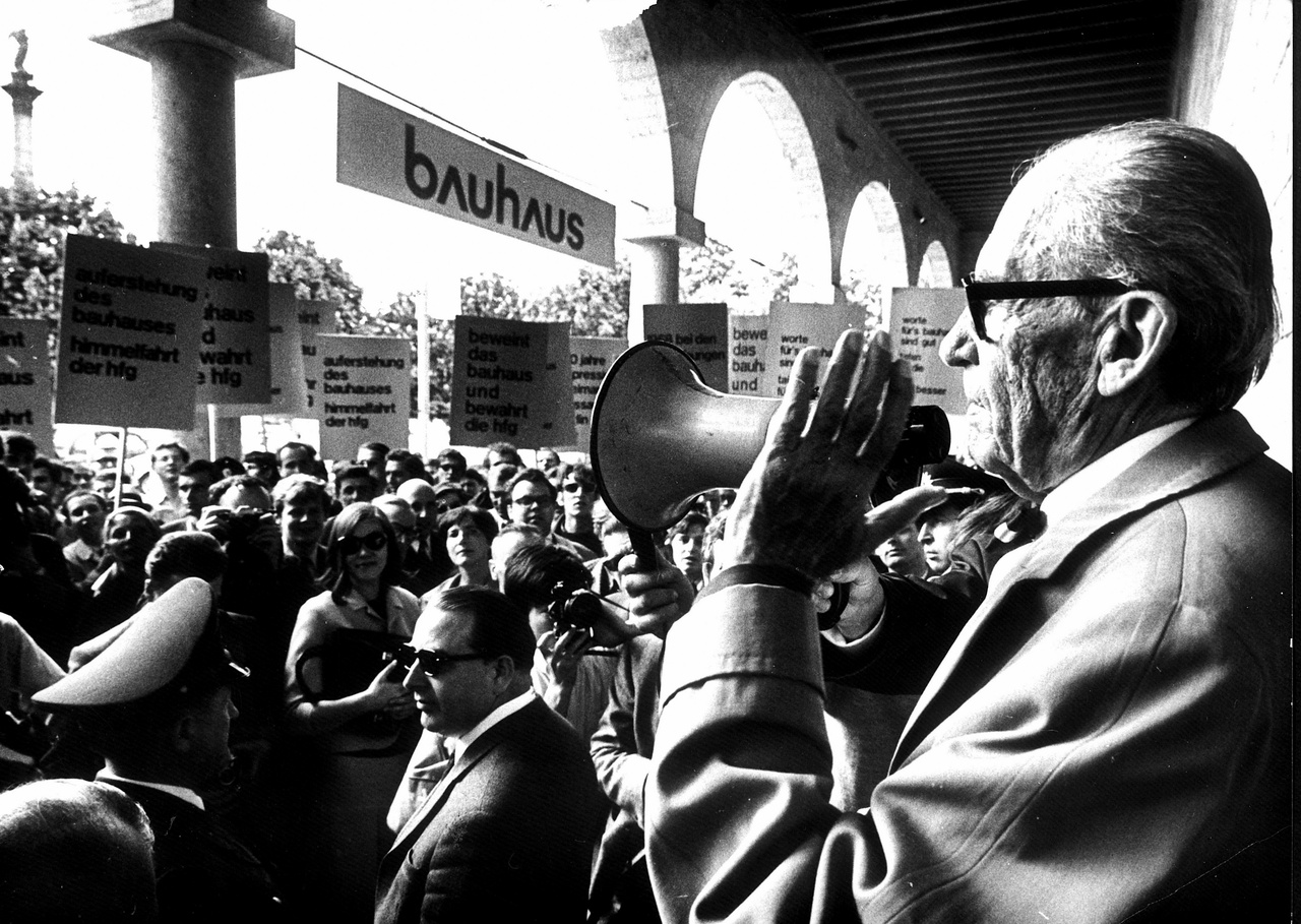 Titelbild: Walter Gropius am Tag der Ausstellungseröffnung. Er richtet sich mit einem Megafon an die Demonstant*innen, Schwarz-Weiß-Fotografie