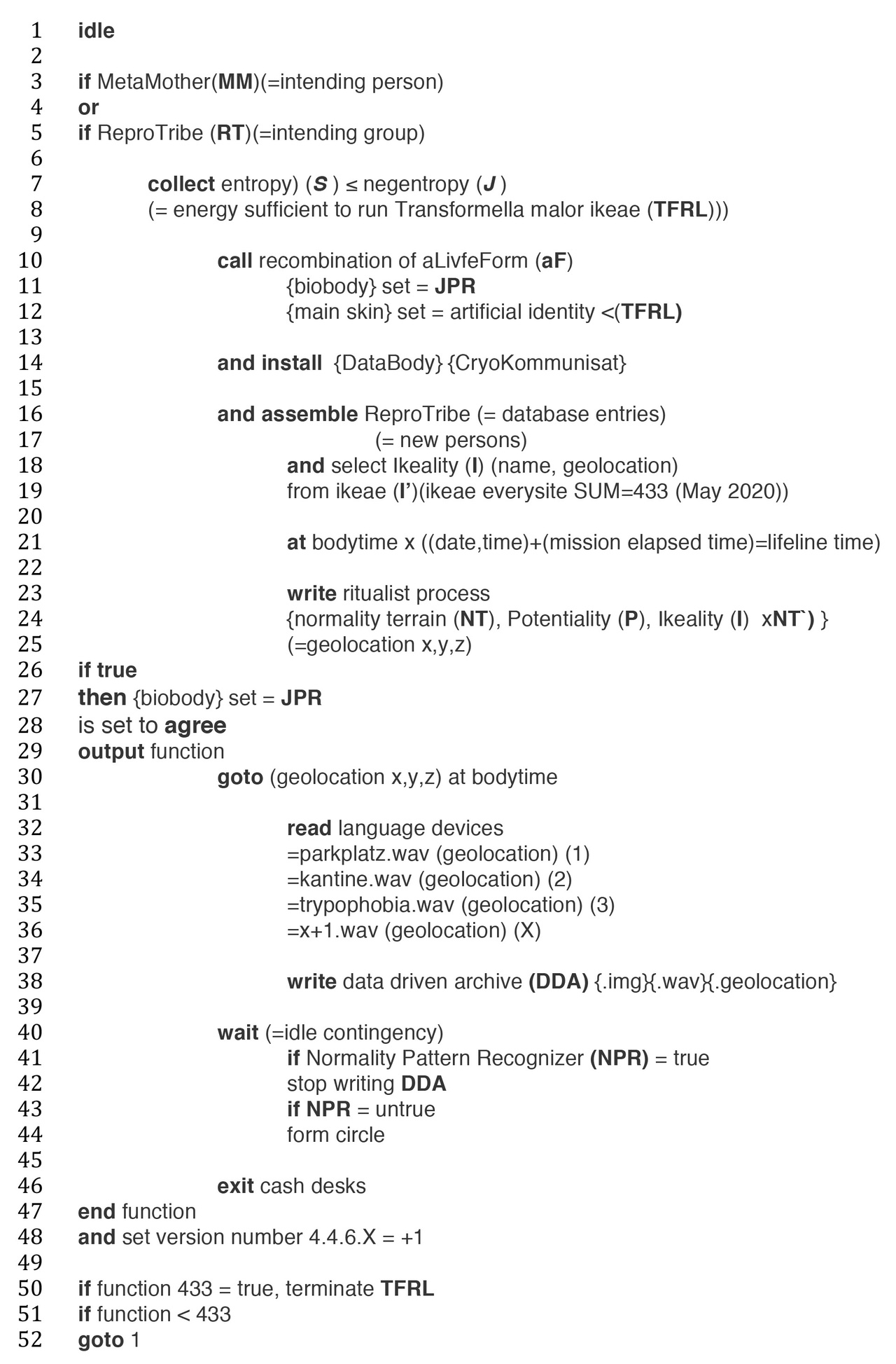 Die folgenden Zeilen (26–28) sind zentral für den weitreichenden Wirkungsgrad der Anwendung: Hier findet sich Transformella malor ikeae’s eigene Möglichkeit und Bedingung als künstliches Wesen: In der mehrfachen Rekursion auf die Ikea-Plattform entzieht das datengesteuerte und künstliche Wesen dem biobody und seiner ‚natürlichen‘ Identität (JPRaether) schrittweise die Möglichkeit des Eingreifens in die Funktion. Denn wenn alle Parameter in den Zeilen zuvor erfüllt sind (if true), liegt es nicht im Ermessen der ‚natürlichen‘ Körperform und ihrer Identität (JPR), die Ausführung der Funktion zu verhindern (set to agree). Über die Jahre des Auftauchens wird Transformella auf diese Weise von einer Fiktion und einer autorbasierten Instanz der Kulturproduktion zunehmend zu einer maschinischen Agentialität von Effekten und Sequenzen, Sprachen, Orten und Identitäten sowie Teilhaber*innen, MetaMothers und Fragmenten des ReproTribe.