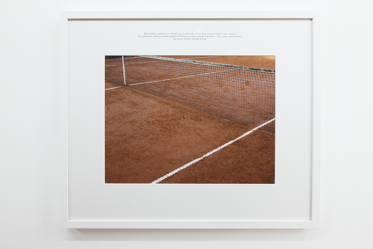 „Anna K.“ ist aber auch eine fotografische Serie (2017), die an analytische Fotografie der 70er Jahre erinnert und die Tennisplätze in seltsamen An- und Ausschnitten zeigt. Auf die die Bilder einfassenden Passepartouts sind kommentierende, eigentlich aber ganz unabhängige Bildunterschriften in lettischer Sprache gedruckt. An Stelle von Sätzen, die über Lifestyle choices als Selbstentwürfe sprechen, wie es sie in früheren, ähnlichen fotografischen Serien von Kaspar gab, werden dieses Mal Dinge und Verhältnisse angesprochen, von denen der Kunstmarkt nur ein Teil ist und mit denen man auch als Künstler etwas zu tun hat, ob man will oder nicht. Während aus der Aufforderung zum Mitmachen, ob beim Joggen oder Einkaufen, immer nur latent eine Drohung sprach, wird der Fokus hier weiter: Die Freunde, das Privatleben, das „Sachen machen“ sind in einer Ökonomie eingeschlossen, die Krisen produziert, die einen auch betreffen können, ohne dass die eigenen (Kauf-)Entscheidungen darauf Einfluss haben.