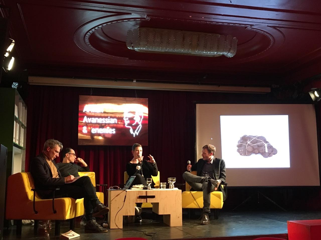 - Armen Avanessian, Sina Najafi, Clémentine Deliss, Tom McCarthy, „#16 Tom McCarthy’s Satin Island: Company Report“, Volksbühne Berlin, 2018. Foto: Marie-France Rafael