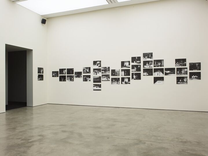 Mehr als 100 Schwarz-Weiss-Fotografien ohne Rahmen direkt an die Wand gepinnt und mit einer Tonspur von Musikfragmenten kombiniert – der Beginn von Rosalind Nashashibis Ausstellung im ICA versammelt mit In Rehearsal (2009) Eindrücke einer Opernprobe in Berlin. Die Musik setzt ein und stoppt. Sänger/innen beginnen ihre Gesangsparts, um sich auf Geheiß des Regisseurs wieder zu unterbrechen. Auf einigen Aufnahmen suchen die Schauspieler/innen ihre Position auf der Bühne und zum Gegenüber, vertiefen sich konzentriert in ihre Partitur oder lauschen den Anmerkungen Dritter. Auf anderen suchen sie das Gespräch mit Kolleg/innen oder ziehen sich aus dem Gruppenverbund zurück, um zu entspannen oder den eigenen Weg auf dem Weg zur Rolle zu überdenken. In Rehearsal formuliert Fragen nach dem Verhältnis des Individuums zu der es umgebenden Gruppe und den damit verbundenen impliziten bzw. expliziten Machtstrukturen sowie nach Selbstinszenierung und -versunkenheit.