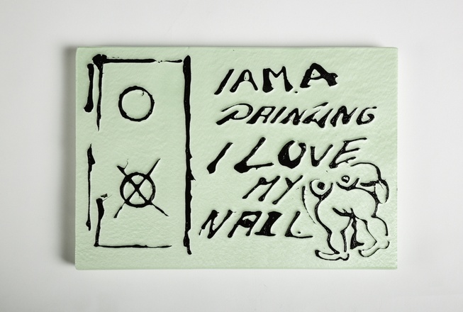 Andreas Slominskis Sonderedition für Texte zur Kunst stammt aus seiner Serie „xyz erotic vol.“ Auf pastellfarbenem Dämmmaterial setzen sich reliefartige Zeichnungen ab: Karikaturen und schmutzige Witzchen, Porno-Motive, die in Slominskis Objekten zum Bildmotiv erhoben werden. Billiges Material scheint auf billige Motive zu treffen. Jedoch beansprucht die krakelige Aufschrift, die die vorliegende Edition schmückt, den Status der Malerei; und auch das Polystyrol, das ihr als Untergrund dient, entpuppt sich als weit dauerhafteres Material, als es Öl und Leinwand je sein können. Die Arbeit wird als die Hommage eines Bildes an seinen Nagel, an seine Aufhängung lesbar – ein gegenseitiges Abhängigkeitsverhältnis, das das Gemälde zum flachen Objekt an der Wand verdammt.