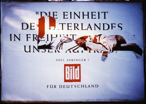 Die Aufnahme für die Edition der amerikanischen Künstlerin Martha Rosler, „Berlin Park“ (2016), entstand 1990 in einer Berliner Grünanlage im Dämmerlicht. Es ist das Bild einer teilweise heruntergerissenen Werbetafel. Die von Rosler bekannten Techniken wie Collage und Aneignung werden hier von einer gefundenen Geste der Zerstörung ersetzt. Rosler, die sich oft der Sprache des Konsums und der Massenmedien bedient, um historische Konfliktachsen aufzuführen, hebt in „Berlin Park“ die Brüchigkeit territorialer Repräsentation hervor. Die Fotografie ist die zufällige Überblendung zweier Formen von Deutungshoheit: Buchstäblich hinter der staatstragenden Ansprache des Zeitungsmoguls Axel Springer – das Zitat wurde posthum durch sein Flaggschiff „Bild“ plakatiert – kommen weitreichende wirtschaftliche Interessen zum Vorschein. Jenseits der zerfetzten Einheitsrhetorik aus der Zeit der deutschen Teilung erkennen wir den Marlboro-Mann – Ikone krebserregender „Westprodukte“. Das Lasso in der Hand, scheint er den Aufruf Springers, der bekanntermaßen die Zentrale seines rechtskonservativen Medienimperiums an der Demarkationslinie zwischen Bundesrepublik und „wildem Osten“ errichtet hatte, zu sprengen. Damit spielt das Bild nicht zuletzt auch auf die territoriale Reorganisation an, also auch auf die Gentrifizierung des wiedervereinigten Berlin, die zeitgleich zur Aufnahme des Fotos begann. Kontrastiert wird der Kurzschluss von Bedeutung durch Fläche, den beide Anzeigen wie unterschiedlich auch immer formulieren, durch ihre eigene Medialität, die Werbetafel, die sich in Roslers Bild als eher entblößend denn repräsentativ erweist.