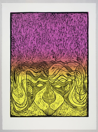 Charline von Heyls Edition für „Texte zur Kunst“ ist ein Linolschnitt mit dem Titel Mädchen. Das Motiv erscheint in schwarzen Konturen auf einem zweifarbigen Hintergrund, der in sogenannter Rainbow-Technik gedruckt wird, sodass das fast aggressive Pink des oberen Bilddrittels sich mit dem von unten aufsteigenden, mentalen Gelb mischt. Dies folgt der Teilung des Motivs und verwischt diese zugleich in einen Verlauf aus verschiedenen Orangetönen. Das durch die schwarzen Linien des Linolschnitts strukturierte Blatt zeigt in seiner unteren Hälfte einen Kopf; das Gesicht ist uns frontal zugewandt, der Scheitel sitzt mittig im Bild, und die Symmetrie des Schopfes füllt den Bildraum bis an die schwarze Rahmung. In von Heyls zugleich an Jugendstil und psychedelische Grafik erinnerndem Motiv trifft eine dekorative Linienführung nicht zuletzt dank des Spiels zwischen Motiv und Titel auf eine aufgeladene Thematik: Das Mädchen ist ein Löwe.