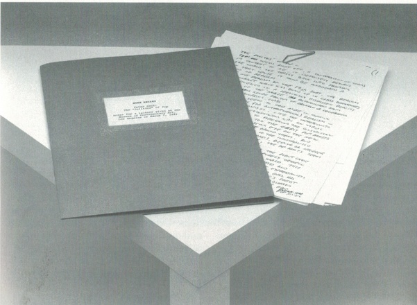 Mike Kelley gehört zu den Künstlern, die sich ausführlich mit bestimmten Künstler-Vorbildern befassen und die für deren Wiederentdeckung oder Neubewertung mitverantwortlich sind, die durch die eigene Popularität vorangetrieben wird. Mike Kelley hatte sich einmal Notizen zu dem "Neo-Pop"-Künstler Peter Saul für einen Vortrag gemacht, den er nicht hielt. Für Texte zur Kunst legte Kelley dieses Manuskript auf einen Coffee Table, einen Beistelltisch. Kelley greift die Entwicklung voraus: Seine Notizen zum Leben und Werk eines Künstlers sind der erste Schritt auf dem Weg zu einem glänzenden Bildband. Diese Aufzeichnungen müsen nicht durchgelesen werden - man kann in ihnen wie in einem Katalog beiläufig blättern. Das Beistelltischen ist das Podest, auf dem sich ein Künstlerleben zum Genuss präsentiert.