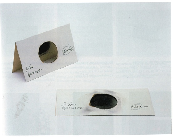 Otto Pienes Medien sind schon immer die Elemente Luft, Feuer, Rauch und Licht gewesen. Sie verkörpern Raum und Dynamik, beziehen Natur und Technik in den künstlerischen Prozess mit ein. Seine Feuerbilder gelten beispielsweise der Formung der kaum steuerbaren Energie des Feuers - Malen ohne subjektiven Gestus, befreit von der dichten Materialität flüssiger Farbe. Für Texte zur Kunst realisierte Otto Piene Rauchzeichnungen, die das Prinzip der Schablone mit dem energetischen Potenzial des Naturelements verbinden. Durch die kreisförmige Stanzung der Klappkarte hindurch wird der Bildhintergrund mit einer Flamme geschwärzt. „Oculus” ist gleichsam das gespiegelte Betrachterauge, das dem Bild eingebrannt wurde, der Bildgrund das Pendant zur Netzhaut.
