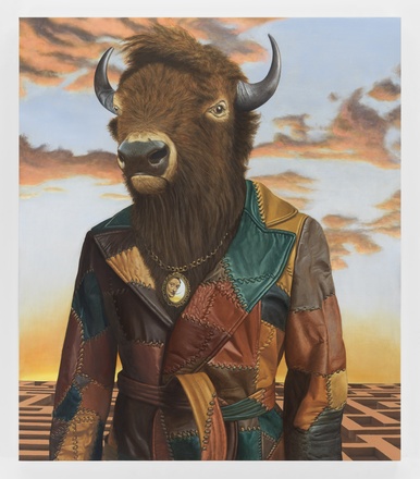 Seit Marcel Duchamp und Guy Debord ist der „Zufall“ ein treuer Verbündeter moderner künstlerischer Produktion, ein Verfahren, mit dem sich der kreative Akt jenseits erlernter Verhaltensweisen und eingeschliffener Muster verorten lässt; jenseits dessen, was der Künstler weiß und kann. Dieser Prozess dient Sean Landers als Ausgangspunkt seiner neuen Malereiserie „Small Brass Raffle Drum“, aus der diese Edition für TEXTE ZUR KUNST stammt. Die titelgebende Lostrommel, einen altmodischen analogen Zufallsgenerator, befüllte der amerikanische Künstler mit 300 Holztäfelchen, auf denen jeweils ein Merkmal oder Element verzeichnet war, das ihm bei der Durchsicht seiner malerischen Produktion der letzten 25 Jahre ins Auge gesprungen war. Dann loste er jeweils sieben der Täfelchen aus, um die Komposition einer neuen Arbeit aus über 40 Billionen verschiedenen Möglichkeiten festzulegen. Die Lostrommel fungierte so als eine Art externes Gehirn, auf dessen Entscheidung Landers dann reagierte. Bei „Buffalo Minotaur“ etwa zog er unter anderem die Karten „Labyrinth“, „Sonnenuntergang“, „Büffel“, „Minotaurus“, „Lederjacke im Stil der 1970er“ und „Salvador Dalí“, womit nicht nur die autonomen Assoziationen in das Feld der Malerei eintraten, die sich (z.B. durch akademische oder popkulturelle Diskurse) mit jedem dieser Stichworte verbinden, sondern auch die spezifische Rolle, die sie in Landers’ eigenem Werk gespielt hatten: „Minotaurus“ verweist auf ein Bild von ihm nach einem Gemälde von George Watts, das in der Tate hängt; „Dalí“ bezieht sich auf die Reihe surrealistischer Malereien, die Landers 2014 anfertigte, und so weiter. Wie der Künstler diese Signifikanten dann in ein spannungsreiches erzählerisches Verhältnis zueinander setzt, verrät etwas über sein Seelenleben. Unsere Edition zeigt womöglich ein Porträt des Künstlers als … junger Büffelminotaurus?