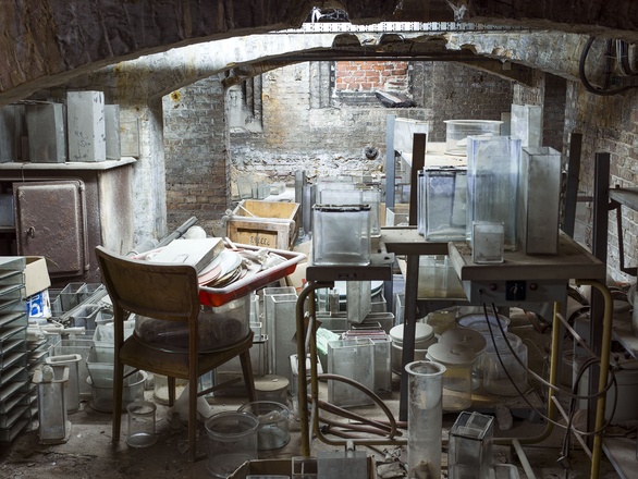 Das Motiv von Thomas Struths Edition für Texte zur Kunst erscheint dem kunsthistorisch geschulten Auge vertraut: Ein enger, niedriger Raum, vollgestellt mit Tischen, auf denen sich leere, mit einem grauen Schmutzfilm belegte Wasserbehälter stapeln, ein einziger bescheidener Holzstuhl, ein kleiner Ofen oder Schränkchen im Hintergrund – all dies mag das tradierte Bild eines chaotischen Künstlerateliers evozieren. Doch tatsächlich dienen die Schläuche und Gefäße der Konservierung von Gewebepräparaten. Die Aufnahme zeigt einen Lagerraum im Keller des Campus der Charité in Berlin-Mitte, um die Jahrhundertwende erbaut und heute vom Medizinhistorischen Museum genutzt. Struth hat an der Charité mehrere Fotos aufgenommen, suchte sie nicht zuletzt als Ort der wissenschaftlichen und technologischen Innovation auf: als Ort, an dem Zukunft gemacht wird. So zeigt eine Aufnahme von 2012 einen Operationsroboter in Aktion. Für das vorliegende Bild jedoch kehrt Struth diesen Blick um, betrachtet nicht medizinische Neuerungen, sondern deren achtlose Ablage(rungen). Was hier abgestellt wird, ist auf doppelte Weise technisch überholt, vernachlässigt und doch nicht ohne Wert: ein Wert des Vergessenen, den Struth als Tableau inszeniert und dabei jede mythische Aufladung an der klirrenden Schärfe des Kamerablicks bricht. Was in Struths Edition augenfällig wird, ist nicht zuletzt der Wunsch des Innehaltens und Betrachtens angesichts rasenden Fortschritts; das Bedürfnis, vergangene wie aktuelle „Innovation“ mit einem Rahmen zu versehen, bis sie sich schließlich zur scheinbar vertrauten Komposition kristallisiert.