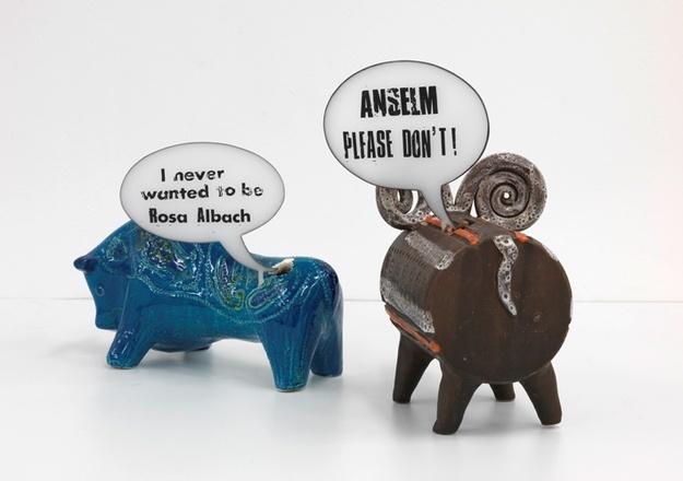 Betritt man eine Ausstellung des in Frankfurt am Main lebenden Künstlers Tobias Rehberger, gerät man in ein beglückendes, wohl organisiertes Arrangement aus knalligen Farben, asymmetrischen Formen, unvermuteten Materialkombinationen und mit spielerischer Geste eingesetzten Referenzen. Rehbergers künstlerische Praxis kreist seit jeher darum, „interessante Fragen in Bezug auf die Idee von Skulptur“ aufzuwerfen, wie er es selbst einmal formulierte. Dafür bedient er sich einer reichhaltigen Palette von Bruchstücken aus Mode, Design und Kunst. Die Balance zwischen diesen Bereichen zu finden, gelingt Rehberger durch den kontextspezifischen Einsatz von funktionalen Einrichtungsgegenständen, die in einem Zusammenhang mit charmant desolat wirkenden Objekten gesetzt werden. Die Übergänge sind indes fließend. So werden Motive von Einladungskarten zu begehbaren Raumausstattungen und diese wiederum zu Strickvorlagen für Galeristenpullover. Was ist Kunst, wenn sie auch immer wieder etwas anderes sein kann, scheint Rehberger zu fragen – und wofür braucht es überhaupt den Künstler? Die Arbeit an der Oberflächenwirkung von Objekten, die Möglichkeiten diese wahrzunehmen, sowie die Frage nach der Funktion der Dinge untersucht Rehberger – dem Klischee der genialistischen Künstler-Autorschaft entgegenwirkend – gerne in Kooperationen mit anderen und mit Hilfe von kommunikativen Themenfindungsprozessen. Für „Texte zur Kunst“ hat Tobias Rehberger exklusive Keramikfiguren aus der inzwischen zum Klassiker gewordenen Serie „Rimini Blu“ des italienischen Designers Aldo Londi – der auch für Lucio Fontana produzierte – angeeignet und sie um ein Element erweitert. Die handgemachten Tierfiguren, die alle das charakteristische blau eingefärbte Muster der Serie aufweisen, wurden jeweils mit einer aus Acrylglas angefertigten Sprechblase versehen, auf der verschiedene Ausrufe geschrieben stehen. So scheint zum Beispiel ein Hund „I never wanted to be Rosa Albach“ zu sagen, und erinnert damit an Romy Schneider, die genau dieses Pseudonym verwendete, um von ihrem lieblichen Sissy-Image Abstand zu nehmen. Jedes dieser dekorativen Designtiere erzählt damit ebenso schlicht wie ergreifend von seinem ursprünglichen Kontext und öffnet darüber hinaus Projektionsflächen für neue, assoziative Geschichten.